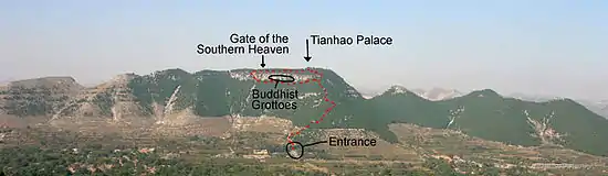 Haotian Temple (Hao Tian Gong in pinyin) measures 150 m from north to south and 100 m from east to west. It lies on the summit of Tuoshan, and commands a view northward to Qingzhou. The temple itself consists of a group of ancient structures, including an old theatre, Yuhuang Palace, Seven Treasures Cabinet, and a garden of stone 'stelae' or tablets. A tablet on the site records the rebuilding of the temple in the Yuan dynasty (1271–1368). The temple has undergone further repairs since 1986.