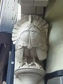 The Turkey Cafe is a building with a flamboyant Modern Style (British Art Nouveau style) facade in Granby Street, Leicester, England. It was built in 1900 and is now a Grade II listed building, once again used as a café.[1] The facade puns on two meanings of "turkey", with a vaguely Eastern exotic style of architecture and three large turkey birds on the facade, one sculpted on each side of the ground floor shopfront and another forming a large coloured panel of Royal Doulton tiles right at the top.[2]