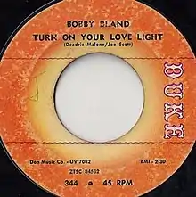 "Turn On Your Love Light" was one of Bobby Bland's most popular singles. It entered the Billboard R&B chart on December 4, 1961, eventually reaching number two during a stay of fifteen weeks.[4] It was also a Top 40 hit, reaching number 28, one of Bland's highest showings in the pop chart.[4] In 1999, the song received a Grammy Hall of Fame Award[5] and is included in the Rock and Roll Hall of Fame list of the "500 Songs that Shaped Rock and Roll".[6]