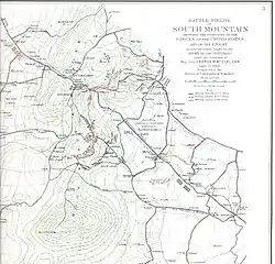 The Turner's and Fox's Gaps Historic District comprises the Civil War-era battlefield involved in the Battle of South Mountain, which took place on September 14, 1862. The district extends on the west to the slopes of South Mountain in the area of Zittlestown, and to the east beyond the foot of the mountain to the small community of Bolivar. The district is characterized by steep mountain terrain in the west and open farmland in the east, with Turner's Gap to the north and Fox's Gap to the south. The district includes 115 contributing buildings and structures. The most significant contributing buildings are the Mountain House Inn (now the Old South Mountain Inn) and the White House Inn, or Beachley House. Also included in the list is the Reno Monument at Fox's Gap, shown at right. The Old National Pike, now known as U.S. 40 Alternate, passes over South Mountain at Turner's Gap.[2]