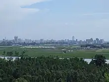 View southwards from Mangyong Hill overlooking greenhouses on Turu Island with buildings including the twin-towered Koryo Hotel visible on the southern bank