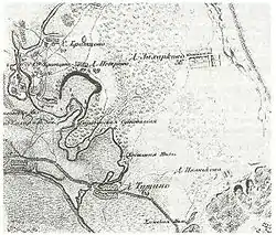 The camp was located on the Volokolamsk Road on a hill outside the village of Tushino; it was located between the Skhodnya and Moscow Rivers, in the place where the Skhodnya flows into the Moskva River, while limning a loop. The camp is located on a high hill from which the territory was visible for several miles in the direction of Moscow. On three sides the hill was surrounded by cliffs. On the fourth side, that is, from the west (from the side of the Savior Monastery on Vskhodnya); the camp was surrounded by an earthen rampart, the remains of which were visible at the beginning of the 20th century. In addition, wooden fortifications were built. The Cossack camp was separated from the main camp by the river; as for False Dmitry himself, he lived in a palace built to the west of Tushino near the Spassky Monastery on the banks of the Moskva River – on a hill surrounded by a rampart and a moat and since then received the name "Tsarikova Gora", which remained until the beginning of the 20th century.[1]