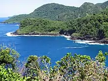 Tutuila is a fairly small and narrow island, measuring roughly 33 km (21 mi) across and little more than 3 mi (4.8 km) from north to south at its widest point.[12] The area of this volcanic island of early Pliocene age is 142.3 km2 (54.9 sq mi) with a shore line of 101.3 km (62.9 mi). The hill range which runs from west to east is rugged and winding with the northern coast line having steep cliffs and unusual coast line. However, the southern part of the island has flatter terrain. Good beaches are located at many places along the coast. It has a wet tropical climate. The highest point in the Tutuila island is the Matafao Peak which is at an elevation of 653 meters (2,142 ft), which is highest peak in the island. There is trail opposite to the Mount ʻAlava peak (483 km (300 mi)) which dominates the northern part of the island.[12] This 9.7 km (6.0 mi) trail is approached by a metal stairway from the southern end which goes right up to the peak.[12] Trekking along the ridge through the rain forests without any additional support system, the scenic beauty of the South Pacific Ocean provides a delightful sight.[1][2]
