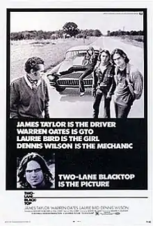 Two-Lane Blacktop is a 1971 American road movie directed by Monte Hellman, written by Rudy Wurlitzer and starring songwriter James Taylor, the Beach Boys drummer Dennis Wilson, Warren Oates, and Laurie Bird.[1]