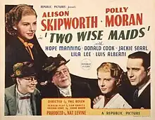 Two Wise Maids is a 1937 American drama film directed by Phil Rosen, written by Samuel Ornitz, and starring Alison Skipworth, Polly Moran, Irene Manning, Donald Cook, Jackie Searl, and Lila Lee. It was released on February 15, 1937, by Republic Pictures.[1][2][3]