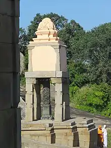 The pillar stands facing the enclosure leading to the monolith of Gommateshwara (Bahubali). On the shaft of the pillar are floral carvings depicting creepers and bell-shaped flowers.[3] It has a square base with images of two important 10th-century Jain personalities, Chamundaraya and his guru Nemichandra carved out is relief on one face of the base. They are seated on a platform (adhisthana) and the guru appears to be receiving an object from his disciple with his right hand. They are flanked by attendants (chouri or fan bearers) while Chamundaraya's queen Gagan, her hair tied in a knot, is seen in the background.[3][5]
