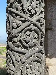 The Tyagada Brahmadeva Pillar (or Chhagada Brahmadeva Pillar) is a decorated free standing pillar (lit, Stambha), 2.3 m tall, commissioned by Chamundaraya, an important minister and commander in the Western Ganga kingdom, during the rule of King Marasimha II (963–975), Rachamalla IV (975–986) and Rachamalla V.[1][2] The pillar dates to around 983 C.E. and exists on the Vindyagiri hill (called Dodda Betta in local Kannada language) in the important Jain heritage town Shravanabelagola, in the Karnataka state, India.[3] On the base of the pillar, on the north side, is an inscription in old Kannada language of the same period,[4] which according to epigraphist and historian B.L. Rice confirms Chamundaraya's involvement in the erection of the pillar.[5][6] Free standing pillars are a characteristic feature of the Western Ganga art and are broadly classified as "Mahastambha" (or "Manastambha", "Indrastambha") and "Brahmastambha".[3][7]