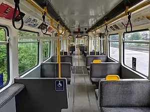 Between 2012 and 2015, 86 Metrocars were refurbished and repainted in a black and yellow livery.[13] The refurbishment reduced the number of liveries in use. Metrocars 4033 and 4082 carried a promotional livery for Emirates, although they have since been repainted to match the other units. Unrefurbished Metrocar 4083 continued to carry an Emirates livery.[14] Until 2017, prototype unit 4001 carried its original cadmium-and-white livery whilst 4002 carried an advertisement for the Tyne and Wear Metro website. Both were repainted in 2017 into the same black and yellow livery carried by the refurbished Metrocars, but in September 2019, Metrocar 4001 underwent further repainting into a 40 Years livery with all four previous liveries amalgamated into one.[1] In August 2019, Metrocar 4040 was repainted into the black and yellow livery, and 4083 followed shortly after in May 2020. As a consequence of this, the only liveries that currently exist are the standard black and yellow, and the 40 Years celebration livery on 4001.