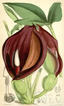 The species is a deciduous, geophytic, perennial herb, which resprouts annually from a rhizome up to 15 cm long and 2โ3 cm in diameter. The deeply trilobed to triangular leaves are borne on stalks up to 30 cm long. The inflorescence has a foecal smell and is pollinated by dung beetles; it is enclosed in a 20 cm long spathe, greenish on the outside and deep purple on the inside. Flowering takes place in summer. The fruits are reddish and about 10 cm in diameter. [1][2]
