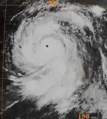 By July 24, Typhoon Bess began to move north-northwest and slow down due to the westward building of the subtropical ridge to the north. The JTWC expected Bess to turn west; however, Bess instead turned southwest on July 25 due to interactions with a trough.[1] By this time, the JMA estimated winds of 130 km/h (80 mph).[3] Shortly thereafter, the JTWC increased the intensity of the typhoon to 175 km/h (110 mph), equivalent to a Category 2 hurricane on the Saffir-Simpson Hurricane Wind Scale (SSHWS). After performing a small loop,[1] the storm maintained its intensity until July 27, when the JMA raised the wind speed of Bess to 180 km/h (110 mph).[3] The typhoon then turned north-northwest[1] while slowly intensifying.[5] On July 28, the system turned northwest along the southwestern edge of the ridge.[1] That afternoon, the JMA estimated winds of 185 km/h (115 mph).[3] Subsequently, Typhoon Bess entered an episode of rapid deepening.[1] Only a few hours later, the JMA reported that Bess had attained its peak intensity of 230 km/h (145 mph), which it would maintain for 12 hours. At 0000 UTC on July 29, according to the JMA, the typhoon attained a minimum barometric pressure of 900 mbar (27 inHg).[3] Later that morning, the JTWC estimated that Bess attained its peak intensity of 260 km/h (160 mph), a Category 5 hurricane-equivalent on the SSHWS,[1] though JMA data suggests that Bess was weakening by this time.[3] At this time, Typhoon Bess was located 460 km (285 mi) to the southeast of Iwo Jima.[1]