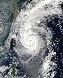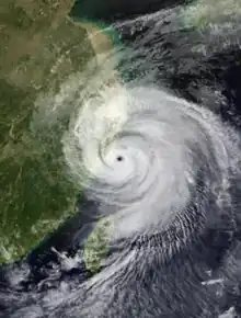 Typhoon Khanun, known in the Philippines as Typhoon Kiko, was the strongest tropical cyclone to make landfall on Zhejiang Province since Wanda in 1956. Khanun developed from an area of convection east-southeast of Yap on September 5, thereafter tracking northwestward. The precursor reached tropical storm status on September 7 and typhoon intensity the next day. The tropical cyclone reached its peak intensity on September 10 with winds estimated at 155 km/h (100 mph) and a minimum barometric pressure of 945 mbar (hPa; 27.91 inHg).[nb 1] After weakening slightly, Khanun moved ashore Zhejiang Province the next day, weakening further as it tracked over land. After recurving into the Yellow Sea on September 12, Khanun became extratropical; these remnants continued to track into the open North Pacific before they were last noted on September 16.[1][nb 2][nb 3]