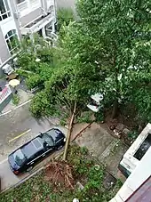 Lekima's tail reached south to Malaysia and hit the northern states of the Malay Peninsula on 9 August, which killed a person, left one missing, and injuring ten others in the states of Kedah, Penang and Perak.[56] The storm also caused damage to 329 schools, and the damage was about RM20 million (US$4.77 million). Wind speeds in some areas were recorded at 100 km/h (62 mph). Hundreds of trees were uprooted.[57] 1,358 houses in Kedah were damaged by Lekima.[58] Total damage in Malaysia reached RM60.2 million (US$14.4 million).[59]