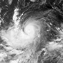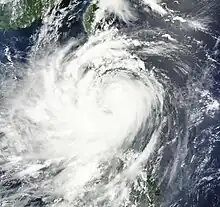 Nanmadol continued to drift north west and made landfall over Gonzaga, Cagayan, Philippines with strong winds of over 95 knots (176 km/h; 109 mph).[14] After interacting with land, the eye of Nanmadol became cloud filled and the eyewall in the northern semicircle became eroded causing the system to weaken.[15] However, the typhoon maintained tightly curved convective banding and central convection for long time after the landfall. The typhoon maintained a favorable upper level outflow, though located in a mid-level subtropical ridge.[16] As Nanmadol started moving away from Luzon, the eye became more evident and central convection became re-consolidated with curved banding.[17] However, the typhoon did not maintain this for long. Nanmadol could not recover very well from interacting with land and started weakening as the cloud tops were warming up and the eye was being filled with clouds again.[18] During the early hours of August 28, Nanmadol struggled to strengthen after passing over the Babuyan Islands. The eye became completely cloud-filled and the outermost rainbands crossed over Taiwan.[19] This prompted the JMA to downgrade Nanmadol to a severe tropical storm.[20] Later that day, the central convection started depleting as the system approached southern Taiwan. At that time, it was located approximately 245 nautical miles (454 km; 282 mi) south of Taipei in the periphery of a mid-level subtropical ridge.[21] Nanmadol continued to weaken as it approached Taiwan and the winds rapidly decreased to under 75 knots (139 km/h; 86 mph) (1-minute sustained), making Nanmadol a minimal typhoon on the SSHS. It maintained a poorly defined eyewall to its south with convective banding wrapped into the cloud filled center.[22]