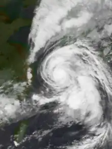On July 26, a disturbance began to develop at the eastern end of a well-defined monsoon trough well to the east of the Philippines. The convection within the disturbance increased as it moved to the north and Tropical Depression 11W formed on July 29. The system continued to intensify, becoming Typhoon Olga two days later as it approached Okinawa Island. On August 1, Olga made landfall on the Japanese island as a typhoon, weakening slightly as it passed over the island. As it moved to the north-northwest it intensified to its peak with 150 km/h (93 mph) winds as it approached Korea. The storm was beginning to weaken as it passed to the west of Cheju Island on August 3 and it made a second brief landfall on the T'aean Peninsula before moving north in the Yellow Sea. The storm made its final landfall in North Korea as a strong tropical storm later that day with 100 km/h (62 mph) winds and became extratropical soon after.[1] Both the JMA and PAGASA considered Olga a typhoon, with PAGASA naming the storm Ising before the JTWC issued its first warning on the developing system.[2]