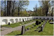 The church's sanctity also made it the preferred place for performing a person's last rites. One of the earliest and most famous of such people was King Gustav II Adolf, whose last rites were held there. The cemetery is located behind the church. The Tyresö Castle forms the background to the cemetery.[1]