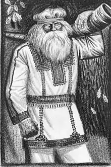 He lives in his palace in the East. He is the reachest one in the whole world. He wears white shirt and golden clothes. In later runes' variants Queen Bee warns him he would be killed by a miraculously born child. His enemy is 70-years Erzya Widow's son born with an iron heel. He uses torama to call everyone to join the battle with the enemies who want to take the homeland. His torama's voice is like thunder, like the voice of the ancestors. In Variant B tradition he leads Mokshas to the East, away from Russian pressure. He parts the sea and let Mokshas to cross it.[9] The Supreme God helps him. When he leads his people to the new lands the Supreme God feeds them, like it is said in the Bible. When Tyushtya grows old he asks his people where do they want them to die. They say they don't want to witness his death. He departs and leaves his torama they might use to call him with when the enemy comes. Then he returnes with his army and that will be the ultimate battle before the doomsday.[10][11]