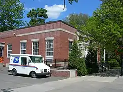 US Post Office-Cooperstown is a historic post office building located at Cooperstown in Otsego County, New York, United States. It was built in 1935-1936, and is one of a number of post offices in New York State designed by the Office of the Supervising Architect of the Treasury Department, Louis A. Simon. It is one story in front and two stories in the rear with and exposed basement. It is constructed of brick on a raised concrete foundation and limestone watercourse and beltcourse. The principal facade is symmetrically composed with a three bay pedimented central section faced entirely with ashlar limestone. The building displays Colonial Revival style details. The interior features a 1938 sculpture by artist Bela Janowsky depicting James Fenimore Cooper and two characters from his writings, Chingachgook and Natty Bumpo.[2]