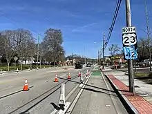 US 23 continues to overlap SR 87 and both routes have auxiliary routes that travel through Cochran. The business route in Cochran is two lanes wide, while the bypass route was widened in 2019 from two lanes to have four lanes and a center turn lane.[2] The northern terminus of US 23 Bus./SR 87 Bus. is also the beginning of the US 129 Alt./SR 112 concurrency. From that point, the center turn lane ends and the route becomes a four-lane undivided highway through the rest of the county and for the next 13 miles (21 km). North of the Cochran area, in Royal, SR 112 leaves to the northeast across from Coley Station Road. US 23/US 129 Alt./SR 87 remains an undivided four-lane highway through the Twiggs County line to the intersection with SR 96 in Tarversville, then narrows down to two lanes for the next 24 miles (39 km). Within this vicinity, US 23/US 129 Alt./SR 87 travels through communities such as Bullard, South Twiggs, Huber, and later Reids with no major intersections, especially as it travels through Bond Swamp National Wildlife Refuge, and has occasional entrances to the refuge. After traveling between some antenna fields for some Macon-area television and FM radio stations, the highways pass one more entrance to the wildlife refuge before crossing the Twiggs–Bibb county line and widens to a three and then four-lane undivided highway. In Smithsonia, the highways use the name Ocmulgee East Boulevard, and then become a four-lane divided highway for the first interchange under I-16 west of old Camp Wheeler, then travels over the Georgia Central Railway bridges before narrowing back down to an undivided two-lane highway as it travels through East Macon along the western edge of Macon Downtown Airport. Just after a small powerline right-of-way, the road curves to the right, then turns left as Emery Highway while Ocmulgee East Boulevard becomes SR 87 Conn. leading toward US 80/SR 19/SR 540 and Jeffersonville Road. Emery Highway is later joined by US 80/SR 19/SR 540, and all six highways (US 23/US 80/US 129 Alt./SR 19/SR 87/SR 540) continue to the northwest. Within Macon, they first enter the city limits by traveling beneath a former Central of Georgia Railway bridge and then travels under a powerline right-of-way before crossing a pair of old bridges over Walnut Creek, where it travels along the northern edge of Ocmulgee Mounds National Historical Park. US 80, SR 87, and SR 540 turn left at Colesium Drive and US 129 Alt. turns right onto northbound Second Street (SR 22), while bi-directional west-to-south and north-to-east turning lanes exist at the southwest corner. US 23 turns left again as Spring Street in a wrong-way concurrency with US 129 at another interchange with I-16, where it instantly crosses the W.L. "Young" Stribling Memorial Bridge (formerly known as the Spring Street Bridge) over the Ocmulgee River, which also includes the Ocmulgee Heritage Trail on the north side and a railroad line on the south side. That concurrency ends when US 23 turns right at Riverside Drive rejoining SR 87, while US 129 turns left. From there, US 23/SR 87 passes by the National Register of Historic Places (NRHP)-listed Rose Hill Cemetery as it descends toward a bridge over I-75 at the interchange with SR 540 and the western terminus of I-16 but has no connecting ramps to or from either highway. North of that bridge, the road travels along the southwest side of I-75, and this is the only place that US 23 travels west of I-75 until many miles to the north, in Perrysburg, Ohio (near Toledo). Access to the Interstate is available from US 23 in this area, though. The first point is from SR 247 whose northern terminus is at exit 167. The next is with Arkwright Road at exit 169. Finally, US 23/SR 87 only has an interchange with I-75 at exit 171 north of Macon, and travels more toward the north, passing by The Shoppes at River Crossing and narrowing down to a two-lane undivided highway, although a long stretch of right-of-way for new northbound lanes can be found along the east side as it encounters a traffic circle with the northwest end of Arkwright Road and former SR 361. This right-of-way shows up at random moments even as it travels through its last miles within Bibb County.