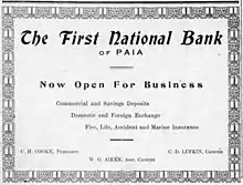 The First National Bank of Paia was organized in March 1913[51] and received charter #10451 from the Comptroller of the Treasury on September 26, 1913[52] capitalized at $25,000.[53] The bank opened for business on October 20, 1913.[43]