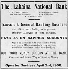 - ↑ "The Lahaina National Bank [Ad]". The Maui News. 31 March 1906. p. 2. Retrieved 20 February 2016 – via Newspapers.com.