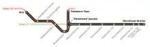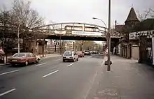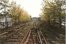In addition, the BVG found in 2005 that a bridge between the Gleisdreieck and Bülowstraße stations, which dates back to the early days of the Berlin U-Bahn and was not renovated after German reunification has been significantly damaged. The renovation of the structure, which lies directly above the tunnel mouth of the North–South mainline tunnel, started on 18 August 2006 and was originally intended to last until the end of the year.[13] Due to problems with the manufacturing of the new steel bridge, the BVG extended the construction work until March 2007.[14] During this period, the U2 was interrupted: the eastern Pankow–Gleisdreieck section was operated almost independently—apart from the connection at Alexanderplatz U-Bahn station. Only push-pull trains ran every ten minutes between Gleisdreieck and Potsdamer Platz due to the difficult situation. The western Ruhleben–Wittenbergplatz section was extended to Warschauer Strasse and formed the new line U12. At this time the Nollendorfplatz–Bülowstraße–Gleisdreieck section was closed. Line U1, on the other hand, was shortened to the Wittenbergplatz–Uhlandstraße section, as in earlier times, while services on line U3 was extended by two stations to Gleisdreieck during the peak.[15] In a €7–8 million reconstruction, the bridge was straightened at the same time, which enabled the top speed to be increased from 40 to 50 km/h. Other projects, such as the modernisation of the U1 elevated line or Jannowitzbrücke station were delayed due to the €8 million renovation that had not been included in the BVG budget. Regular traffic on the U2 line was resumed on 19 March 2007 after the construction work had been completed.[16]
