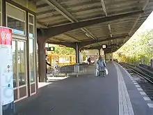 The 110 metre-long U-Bahn station with its blue, white and yellow colour scheme had skylights, which were rare in the Berlin U-Bahn network, to enable natural light to penetrate into the station. It was designed by the architect Orlando Figallo. During the construction, a generous entrance building was built at the same time with a lift and escalators to provided convenient connections to S-Bahn line S2 to Bernau.[9] There are also still plans according to which the U2 line would be extended to the old parish church in Breiten Straße in Pankow. This plan is also included in the Berlin Senate's 2030 financial scenario. This is considered a medium-term priority.[10]