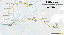 The U3 is a line of the Hamburg U-Bahn. The ring line with a length of 20.68 kilometres (12.85 mi) serves 25 stations. The first part opened in 1912. The line starts in Wandsbek-Gartenstadt and leads via Barmbek into the ring passing through the city center and back to Barmbek.[1][2][3]