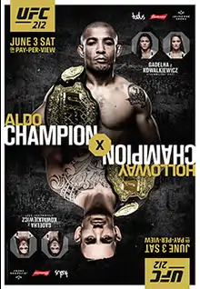 UFC 212: Aldo vs. Holloway was a mixed martial arts event produced by the Ultimate Fighting Championship held on June 3, 2017, at the Jeunesse Arena in Rio de Janeiro, Brazil.[2]