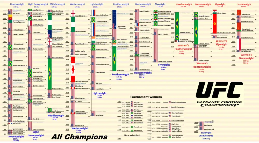 The Ultimate Fighting Championship (UFC) is an American mixed martial arts (MMA) promotion company based in Las Vegas, Nevada. It is owned and operated by TKO Group Holdings, a majority owned subsidiary of Endeavor Group Holdings.[5][6][7][8] It is the largest MMA promotion in the world as of 2023.[9] It produces events worldwide that showcase 11 weight divisions (eight men's and three women's) and abides by the Unified Rules of Mixed Martial Arts.[10] As of 2022, it had held over 600 events. Dana White has been its president since 2001 and CEO since 2023. Under White's stewardship, it has grown into a global multi-billion-dollar enterprise.[11]