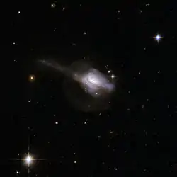 The galaxy has a tidal tail, seen edge on, and a faint halo of stars that was created during the merger.[15] A second tidal tail appears to loop around the nucleus, forming a ring.[3]