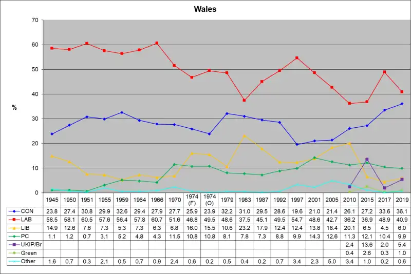Wales is currently divided into forty constituencies of the Parliament of the United Kingdom, which elect Members of Parliament to the House of Commons. After the general election of December 2019, 22 of the Welsh constituencies are represented by Labour MPs, 14 by Conservative MPs, and 4 by Plaid Cymru MPs.[1]