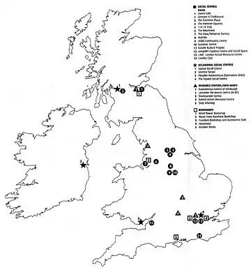 20. 1 2 3 4 5 6 7 8 9 10 "Social Centres Map". Organise Magazine. Organise!. Archived from the original on 25 April 2019. Retrieved 14 May 2019.