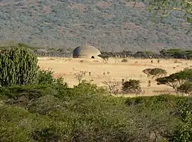 The king's private hut (ilawu) was located in one such triangular compartment and had three or four entrances.[2] His hut was very large and was kept very neat by attendants; it could easily accommodate 50 people. Modern archaeological excavations have revealed that the floor of this large hut was approximately 10 metres in diameter. Archaeologists found evidence inside the hut of 22 large supporting posts completely covered in glass beads.[3] These had been noted in historical accounts by Piet Retief, leader of the Voortrekkers, and the British missionary Owen and American missionary Champion.
