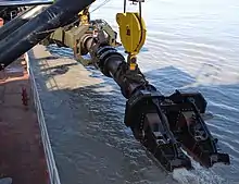 Essayons sucks sand, silt, and mud off the bottom of navigable waterways to increase their depth, creating a channel allowing larger ships to pass. She pulls two suction heads, referred to as "drag heads", along the seafloor as she moves slowly through the water. The drag heads are connected to pipes which are 28 inches (71 cm) in diameter called "drag arms" that descend from both sides of the ship. These drag arms are controlled by two winches each which can lower them to reach bottom as deep as 94 feet (29 m). Loose material on the seafloor enters the drag heads and is pulled up through the drag arms by powerful pumps. It is then deposited in a hopper in the middle of the ship. The ship reaches capacity after about 45 minutes to an hour of dredging. When the hopper is full, the ship sails to an offshore location and opens doors in the bottom of the hopper, allowing the dredge spoil to fall to the sea bottom.[10][16]