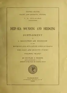 Among the notable discoveries linked to the ship was the definition of bathymetry proving an unexpected at the time and unusual feature of the United States continental slope, now named for the ship as the Blake Plateau. Initial findings of such a plateau were found in June 1880 during investigations of the Gulf Stream.[2] During her first survey season, starting in June 1874, George S. Blake was being used to test deep sea equipment designed by Sir William Thomson, the Thomson Sounding Machine (also known as the Kelvin sounding machine[3]), as modified by Commander Belknap, USN and to bring up specimens from 2,144 fathoms (12,864 ft; 3,921 m) in the Gulf of Maine. By the time the ship reached the Gulf of Mexico in 1875 under the command of Lieutenant Commander Charles Dwight Sigsbee, USN[Note 1] the ship was using a modification of the Thomson sounding machine designed by Sigsbee, known as the Sigsbee sounding machine that was the standard wire sounding device for fifty years,[5] and with the shot release device first tested the previous year with Sigsbee attached to the survey party.[6][7][8]