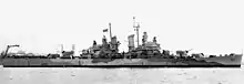 The ship left Pearl Harbor on 9 June to join the fleet at Leyte in the Philippine Islands. She reached San Pedro Bay on 21 June and joined 3rd Fleet.[4] Rather than join the main elements of Task Force 38 for a major attack on Japan, Amsterdam was assigned to a detachment centered on the aircraft carrier Wasp. She formed part of the escort for the carrier, along with the cruisers Oklahoma City, Tucson, and Flint, and seven destroyers. The unit was sent to carry out a raid on Japanese positions on Wake Island on 18 July.[5] By early August, Amsterdam and Oklahoma City had been transferred to Task Group 38.1. Over the next week, she covered the carriers of Task Force 38 during a series of raids on the Japanese home islands. On 15 August, the fleet received word of Japan's decision to surrender.[4][6] By late August, Amsterdam had been transferred to TG 38.2. The ship entered Sagami Bay on 27 August with the rest of TF 38 to begin preparations for the formal surrender of Japan, which took place aboard the battleship Missouri on 2 September.[7] The ship earned one battle star during her short wartime career.[4]