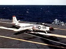 Bennington remained in reserve for almost four years. On 29 October 1950, she moved to the New York Naval Shipyard to receive her SCB-27A modernization. Over the next two years, she underwent a transformation that increased her displacement, length, and beam. Her flight deck was strengthened and widened to accommodate jet aircraft, her island was replaced. She also received many modifications to other equipment, such as catapults and elevators, to accomplish the same purpose. In October 1952, while completing those alterations, she was re-designated an attack aircraft carrier (CVA-20). On 13 November, Captain David. B. Young took command of Bennington in a ceremony attended by more than 1,400, including the Secretary of the Navy Dan A. Kimball and Rear Admiral Roscoe H. Hillenkoetter. Marine Air Group 14, under the command of Colonel W.R. Campbell, USMC reported for duty on Bennington on 13 February 1953, and Bennington set off for the waters off Florida to conduct carrier qualifications. The first arrested landing was made on Bennington since her recommissioning by Lieutenant Colonel T.W. Furlow in his AD Skyraider. Furlow was the commanding officer of Marine Attack Squadron 211. The first jet aircraft to land on Bennington occurred on 18 February by Major Carl E. Schmitt in a F9F-5 Cougar. When the qualifications were over, Bennington headed for Guantanamo Bay Naval Base where she underwent 11 weeks of shakedown training with CVG-7 aboard.
