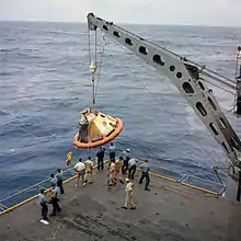 On 18 May 1966, while cruising off of San Diego, California, Bennington hosted the experimental LTV XC-142 aircraft as it executed 44 short takeoffs and landings and six vertical takeoffs and landings, the ship steaming at various speeds to generate different velocities of wind-over-the-deck.[11] She was the prime recovery vessel for the unmanned Apollo 4 mission and on 9 November 1967 recovered the spacecraft which had splashed down 10 mi (16 km) from the ship.