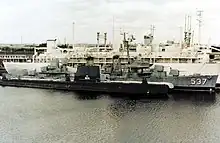 USS Blenny (AGSS-324), foreground, while out of commission in the Reserve Fleet Basin of the Philadelphia Naval Shipyard in Philadelphia, Pennsylvania, in August 1976.