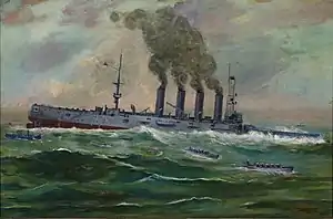Captain Christy was of the opinion, following the sinking, that San Diego had been sunk by a torpedo. However, there was no evidence of a U-boat in the area at the time, and no wake of a torpedo was seen by the lookouts. While it was reported that five or six mines had been found in the area, the idea that she had struck a mine was also considered unlikely as it was thought that a mine would have been more likely to detonate at the bow or the forward part of the ship.[13] It was subsequently reported that experienced merchant officers believed that a mine was the probable cause, due to the violence of the explosion and the rapidity with which the ship sank.[14] In August 1918, the Naval Court of Inquiry appointed to investigate the loss of the cruiser concluded that San Diego had been sunk by a mine, mentioning that six contact mines had been located by naval forces in the vicinity of the spot where she had sunk.[15]