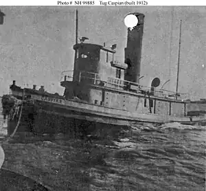 SS Caspian was a steel-hulled commercial tug built in 1912 by John Dialogue and Son at Camden, New Jersey. In early March 1918, the Commandant of the US Navy's 4th Naval District ordered that she be taken over for World War I service. The Navy assigned her the hull classification ID-1380 in anticipation of commissioning her as USS Caspian. However, the Navy never took possession of her, and she remained in civilian service with her owner, P. F. Martin of Philadelphia, Pennsylvania.