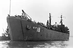 Authorized as the LST-542-class tank landing ship USS LST-1133, the ship was reclassified as a motor torpedo boat tender, assigned the hull number AGP-18, and renamed USS Chiron on 14 August 1944. Chiron was laid down by the Chicago Bridge and Iron Company at Seneca, Illinois, on 16 December 1944, launched on 10 March 1945, sponsored by Mrs. T. S. Tillman, and placed in reduced commission on 23 March 1945 for transit to her conversion yard.[1] On 17 April 1945, she was decommissioned for her conversion into a motor torpedo boat tender. Her conversion took place at the Maryland Drydock Company at Baltimore, Maryland, and after its completion, she was recommissioned USS Chiron (AGP-18).