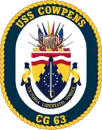 USS Cowpens (CG-63) is a Ticonderoga-class guided missile cruiser in service with the United States Navy. The ship is named after the Battle of Cowpens, a major American victory near Cowpens, South Carolina, in the American Revolution. She was built at the Bath Iron Works in Maine. Cowpens is stationed at Naval Base San Diego.