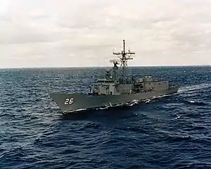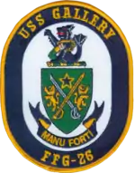 USS Gallery (FFG-26), eighteenth ship of the Oliver Hazard Perry class of guided-missile frigates, was named for three brothers: Rear Admiral Daniel V. Gallery (1901–1977), Rear Admiral William O. Gallery (1904–1981), and Rear Admiral Philip D. Gallery (1907–1973). Ordered from Bath Iron Works, Bath, Maine, on 28 February 1977 as part of the FY77 program, Gallery was laid down on 17 May 1980, launched on 20 December 1980, co-sponsored by Mrs. Philip D. Gallery and Mrs. Daniel V. Gallery, and commissioned on 5 December 1981. Decommissioned and stricken on 14 June 1996, she was transferred to Egypt on 25 September 1996 as Taba (F916). As of 2007, she remained in active service with the Egyptian Navy.[1]