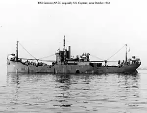 USS Gemini (AG-38/AK-52/AP-75) was a Stratford-class transport commissioned by the U.S. Navy for service in World War II. She was responsible for delivering troops and equipment to locations in the war zone.