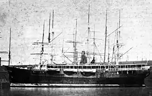 The iron-hulled steamer Gertrude was built in Whiteinch, Glasgow, Scotland as Yard No.100 at the Clydeholm yard of Barclay, Curle & Company as an American Civil War blockade runner and launched on 25 November 1862.[1][2][3] Along with her sistership Emma, she was built for Thomas Stirling Begbie, a London shipowner and merchant.[1] Gertrude was measured as 278grt and 191nrt, with dimensions 164.4 feet length overall, 21.2 feet beam and 12.2 feet depth.[3] She was powered by 2-cylinder oscillating engine of 100nhp, made by John Scott's Greenock Foundry Company, Greenock.[1][3] Gertrude made her first run of the blockade from Nassau, Bahamas to Charleston, South Carolina, arriving 16 March 1863, and returned safely with 820 bales of cotton.[1][4] On her next trip, Gertrude had barely left Nassau when she was chased and captured on 16 April 1863 by the gunboat USS Vanderbilt off Eleuthera Island, Bahamas.[1][5]