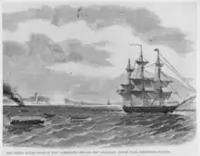 Having been fitted out as an apprentice training ship, Jamestown recommissioned on 14 February 1882 and proceeded to the Atlantic coast via Cape Horn. In her new capacity, she sailed the Atlantic Ocean, voyaging to the West Indies, Spain, and as far north as the State of Maine. While at the Brooklyn Navy Yard on 20 December 1883, Landsman J. W. Norris and Ordinary Seaman Robert Augustus Sweeney jumped overboard and rescued a man from drowning, for which they were each awarded the Medal of Honor.[1] On 31 August 1888, Jamestown decommissioned at Norfolk.