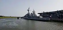 Laffey is currently a museum ship at Patriots Point in Mount Pleasant, South Carolina, alongside two other US National Historic Landmarks: the aircraft carrier Yorktown and submarine Clamagore. In October 2008, it was discovered that over 100 leaks had sprung up in Laffey's hull,[12] and officials at Patriots Point were afraid that the ship would sink at her mooring.[12] An estimated $9 million was needed to tow the ship to dry dock for repairs, prompting Patriots Point officials to secure a $9.2 million loan from the state of South Carolina to cover the costs.[13] On 19 August 2009, she was towed to Detyens Shipyards[13] in North Charleston on the Cooper River for repair in drydock.[14] The rust-eaten, corroded hull was repaired with thicker plating, miles of welding, and new paint.[13] On 16 April 2010, the Board of Trustees of Clemson University reached a lease agreement for Patriots Point organization to moor Laffey adjacent to Clemson's property at the former Naval Base Charleston in North Charleston.[15] Laffey was returned to Patriots Point on 25 January 2012 with more than a dozen former crew members among the crowd on hand to greet her. Said one veteran, "This means a lot of years of fighting to get her saved again. The Germans tried to sink her. The Japanese tried to sink her and then she tried to sink herself sitting here. She's whipped them all and she's back again."[16] It cost $1.1 million to return the ship and to make repairs to accommodate her in a new berth at the front of the museum.[17]