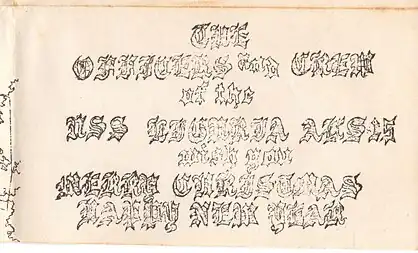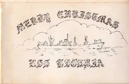 The following images are scans of a ship-board created Christmas card. It depicts the profile of the ship and records her travels and ports-of-call. As she was decommissioned July 1946, the card will have been from 1945.