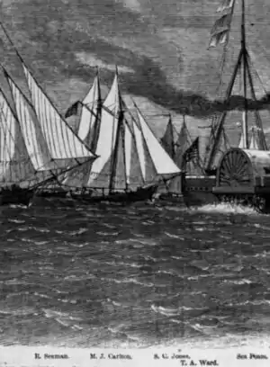 According to naval historian Paul Silverstone, the schooner Maria J. Carlton had been built in Philadelphia, Pennsylvania, before the American Civil War and launched at an unknown date. [1] However, naval historian Craig W. Gaines states she was built in 1859 at Saybrook, Connecticut,[2] while an 1862 account in the Baltimore Sun states she was built in 1856 in East Haddam, Connecticut, from white oak and chestnut wood.[3] She was 98 feet (30 m) long, had a beam of 27 feet (8.2 m), and a draft of 7 feet 8 inches (2.34 m),[2] with a tonnage of 178 tons.[4] Maria J. Carlton was used as part of the packet trade between New York City and Boston, Massachusetts.[3] On October 15, 1861, the United States Navy purchased Maria J. Carlton from a Mr. Warner at Middletown, Connecticut; the previous name remained in use after the Navy took over. After the purchase, Maria J. Carlton was sent to the New York Navy Yard in Brooklyn to be converted for military use.[4] During her Navy service, she had a crew of 28 and was armed with a 13-inch (33 cm) mortar and two 12-pounder howitzers.[2] She was then commissioned on January 29, 1862; her commander was Acting Master Charles E. Jack.[4]